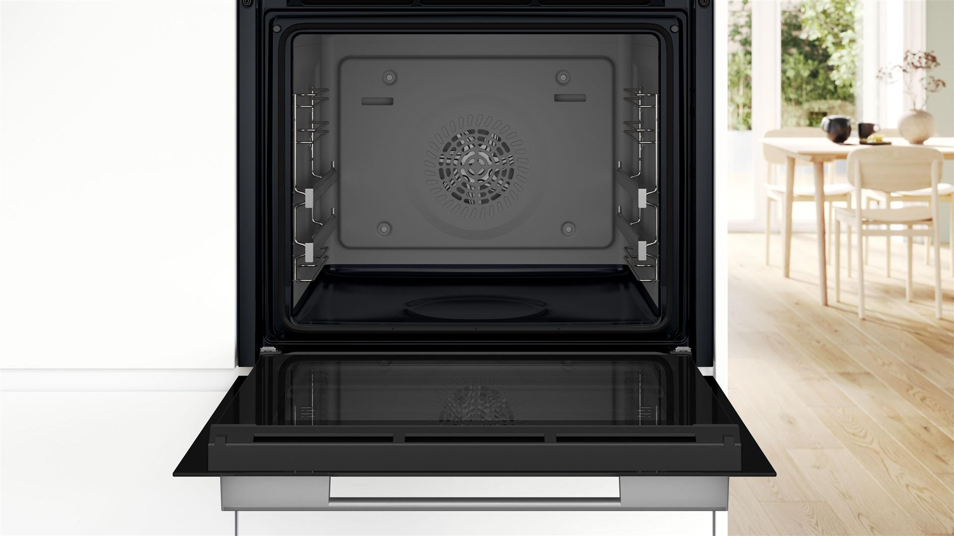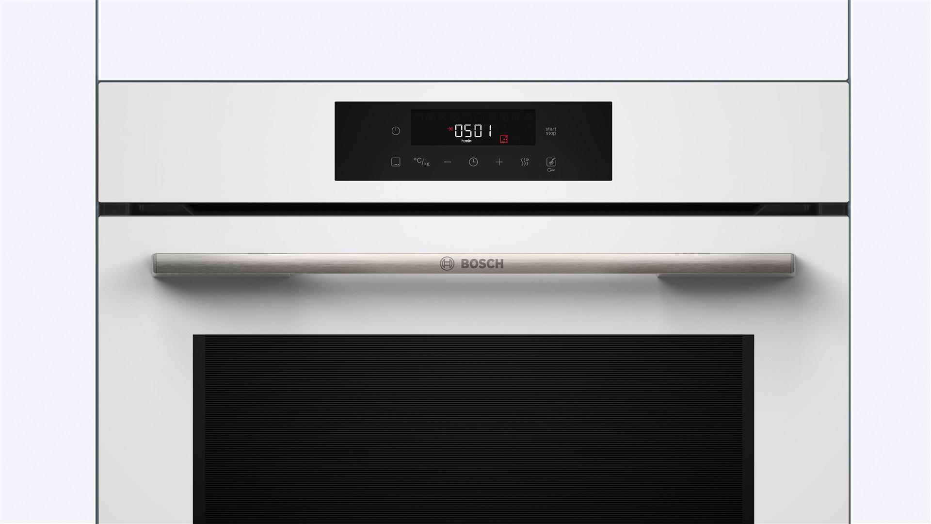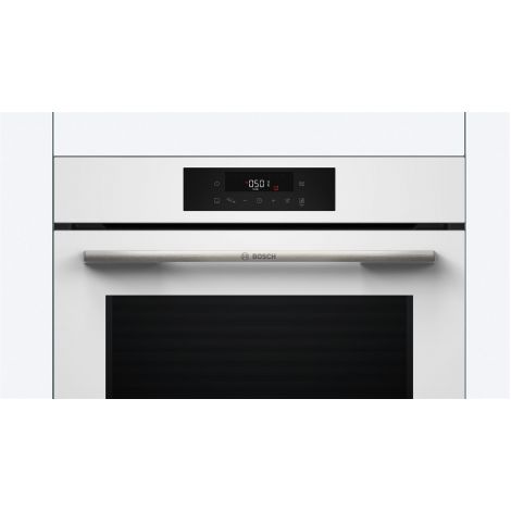 Духова шафа Bosch Serie 6 HJG852YW0T з 8 різними видами нагрівання та 30 автоматичними програмами приготування. Температура регулюється в діапазоні від 30°C до 275°C, а внутрішній об’єм шафи складає 76 літрів. Вона оснащена системою висувного механізму з 5 рівнями та дворівневими телескопічними напрямними з функцією фіксування. Дизайн духової шафи включає сенсорне управління і покриття TitanEmail, що надає їй стильний вигляд. Для очищення передбачена спеціальна програма, яка спрощує догляд за пристроєм. Шафа має електронний годинник і автоматичний вибір рекомендованого рівня температури, з можливістю коригування. Вона також підтримує контроль нагрівання і пропонує 30 автоматичних програм, що значно полегшує процес приготування. Завдяки функції soft closing дверцята легко закриваються, а кнопка відкриття дверцят забезпечує зручність використання. Допоміжна система AutoPilot допомагає вибрати оптимальні налаштування для приготування страв. Шафа має функцію швидкого розігрівання, внутрішнє освітлення (галогенні лампи) з можливістю вимкнення та вентилятор охолодження для безпечної експлуатації.