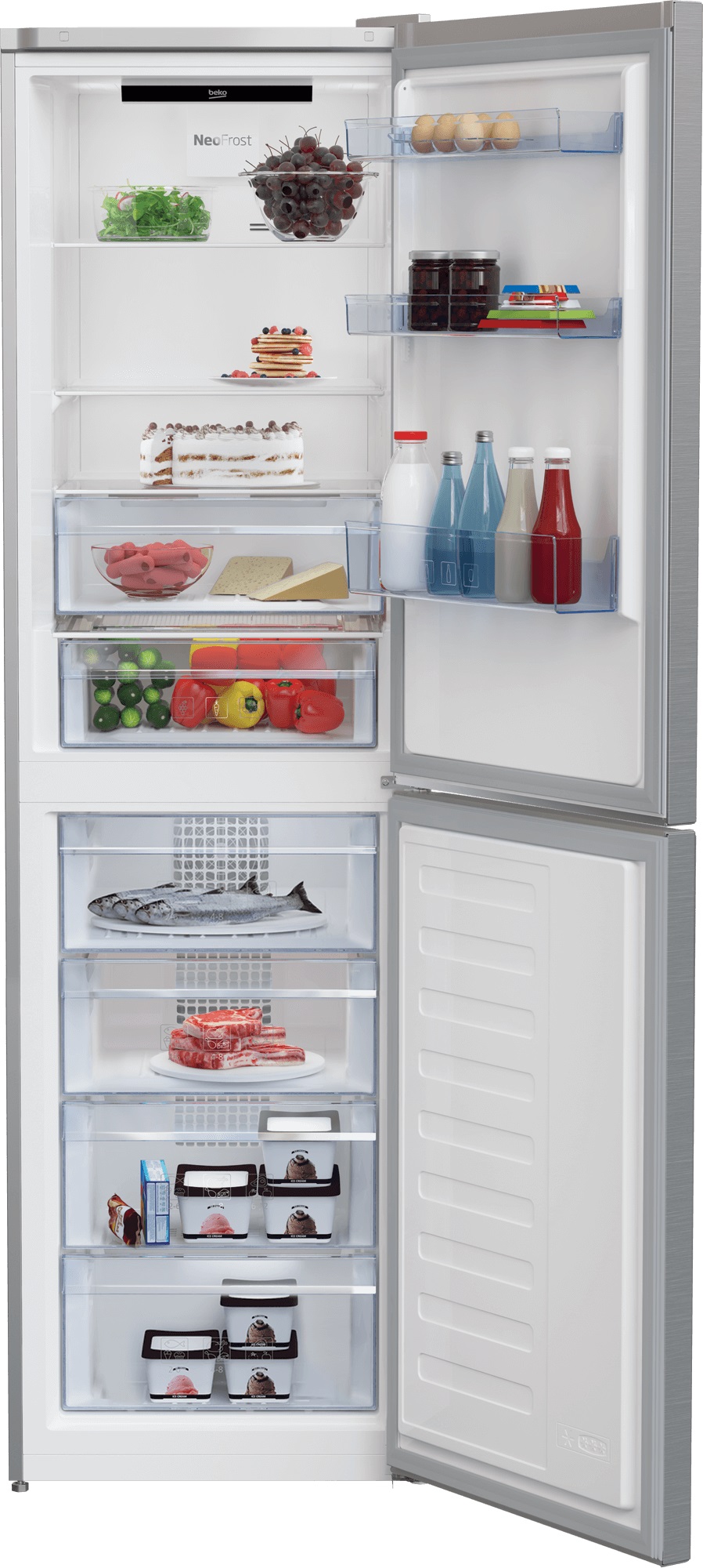 EverFresh+ Сохранение фруктов и овощей свежими до 30 дней Вам бы не хотелось, чтобы свежие продукты испортились слишком быстро. Точная регулировка температуры и влажности позволяет уменьшить образование конденсата в контейнере для овощей, благодаря чему продукты остаются свежими и сохраняют полезные свойства до 30 дней. CoolRoom Мясо, рыба и молочные продукты дольше остаются свежими Для хранения мяса, рыбы и молочных продуктов требуется более низкая температура. В отделении CoolRoom® эти продукты хранятся при температуре чуть выше точки замерзания и при оптимальной влажности. Благодаря этому продукты сохраняют свой вкус и свежесть в два раза дольше. FlexiLift Регулируемая по высоте дверная полка Бывает сложно разместить продукты в холодильнике, особенно в высоких бутылках. FlexiLift позволяет отрегулировать высоту одной из дверных полок по своему усмотрению. Вы можете поднять ее на 8 см, даже если на ней находятся продукты, чтобы освободить дополнительное пространство снизу. LED Illumination Хороший обзор внутри холодильника Бывает сложно увидеть все продукты в холодильнике, особенно в углах и возле задней стенки. Подсветка LED Illumination состоит из нескольких светодиодных ламп, расположенных вверху холодильника и сбоку на уровне каждой полки, обеспечивая превосходный обзор всей камеры. Кроме того, она потребляет меньше электроэнергии, чем обычная подсветка. Безопасное стекло Полки из высокопрочного стекла Не переживайте, ставя большую тяжелую кастрюлю в холодильник с полками из безопасного стекла. Они выполнены из закаленного высокопрочного стекла и выдерживают нагрузку до 25 кг. Эти полки в большей степени устойчивы к появлению трещин и царапин, чем полки из необработанного стекла, поэтому вы можете без опасений ставить на них тяжелую посуду. Режим «Отпуск» Дополнительная экономия электроэнергии Уезжаете в отпуск? Переведите холодильник в специальный режим. Режим «Отпуск» позволяет экономить электроэнергию, отключая холодильную камеру и оставляя работать только морозильную. Благодаря этому вы сохраните замороженные продукты и сократите расходы на электроэнергию.