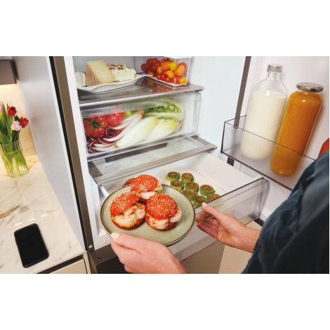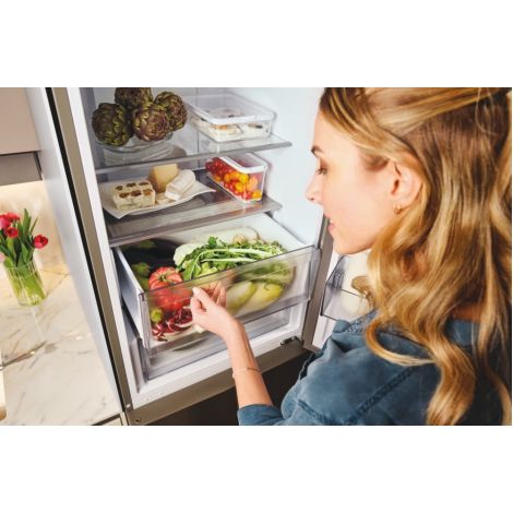 Адаптивна зона вологості Надзвичайно велика, з саморегульованим рівнем вологості холодильна камера, щоб ніколи не бракувало місця для ваших фруктів та овочів, які завжди зберігатимуться за ідеальних умов без необхідності ручного втручання. Нульова зона Нульова температура краще зберігає свіжість овочів і подовжує термін зберігання делікатних продуктів (м’яса, риби). Circle Fresh Бічний потік повітря м’яко огортає продукти, запобігаючи їх висиханню та заморожуванню, дозволяючи зберігати продукти в будь-якому місці холодильника. Ідеальні для сучасних кухонь Спеціальні інтегровані ручки та дизайн дверей, а також зручні петлі для ідеальної інтеграції в кухонний інтер’єр. Дверцята можна перенавішувати як вам зручно та відкривати двері на 90 градусів. XL морозильне відділення Ще більше місця для зберігання великої кількості продуктів.