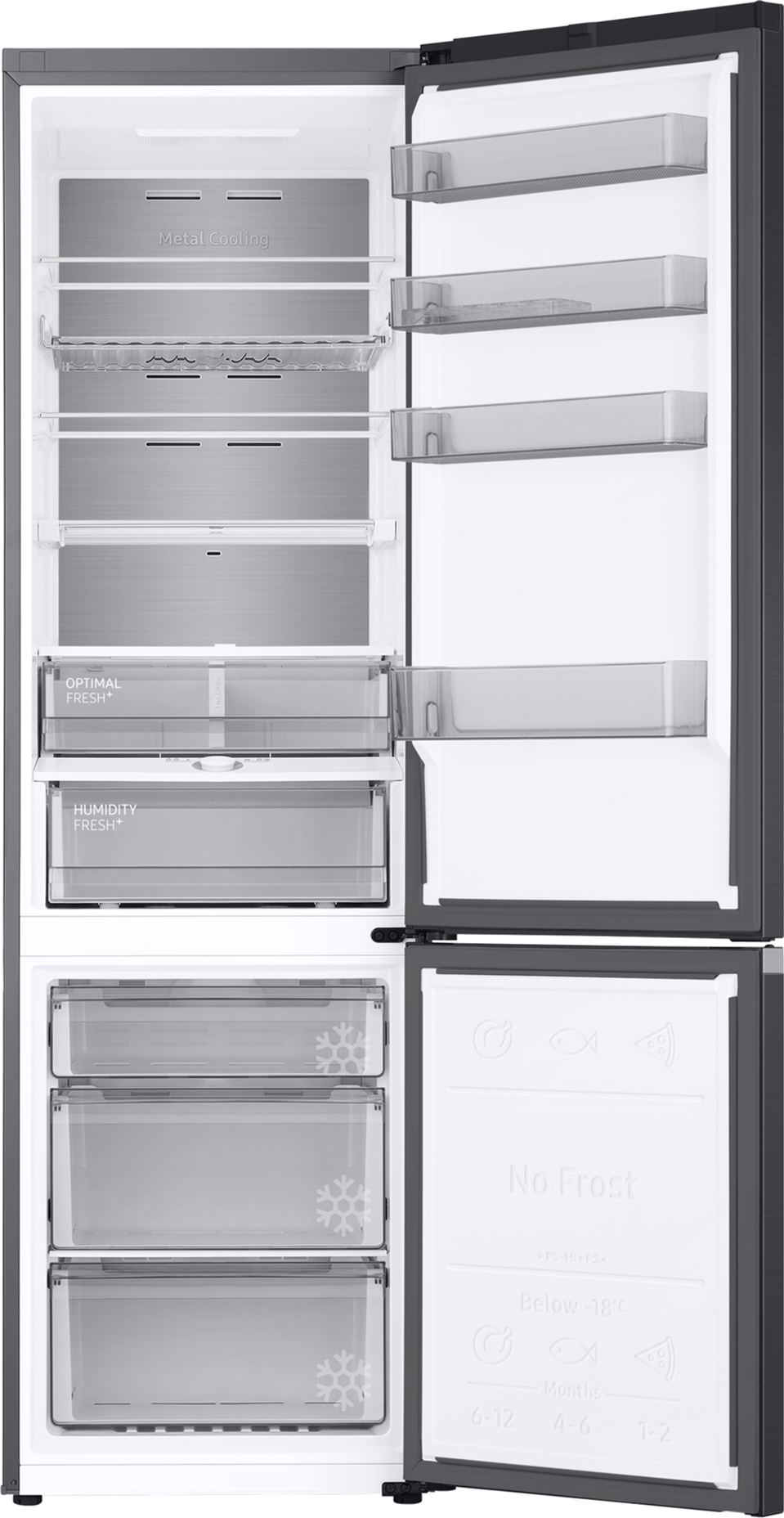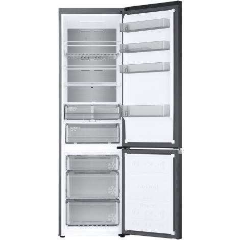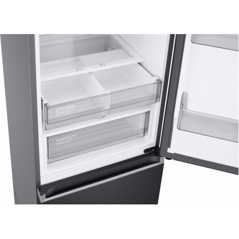 Прежние размеры, больше вместительность Дизайн по технологии SpaceMax Technology Холодильник Samsung с нижней морозильной камерой изготовлен по технологии Space Max Technology, поэтому имеет эффективную теплоизоляцию стенок уменьшенной толщины. Это позволяет сохранить внешние размеры прибора, расширяя при этом его внутренний объем. Таким образом, данная модель отличается от других холодильников такого же размера увеличенным полезным объемом и высоким уровнем энергоэффективности. Технология всестороннего охлаждения Система All-Around cooling Все уголки рабочей камеры холодильника охлаждаются тщательно и равномерно, ведь модель поддерживает технологию All-Around cooling. Система обеспечивает подачу охлажденных потоков воздуха через отверстия над каждой полкой, поэтому внутри прибора поддерживается стабильный климат, а продукты остаются свежими дольше. Вентилируемое охлаждение Технология No Frost Холодильник с нижней морозильной камерой Samsung снижает температуру по технологии No Frost, поэтому выгодно отличается от моделей без такой системы. No Frost обеспечивает вентилируемое охлаждение, благодаря которому регулируется уровень влажности, отсутствует конденсат, иней, наледь, сторонние запахи и существенно продлевается срок службы холодильника. Идеальные условия для хранения овощей, мяса и рыбы Зона свежести Fresh Zone Для хранения овощей, фруктов, рыбы и мяса в холодильнике предусмотрена отдельная зона с оптимальным климатом для таких продуктов. В левой части Зоны Свежести более низкий уровень температуры, что отлично подходит для продления свежести мяса и рыбы. В правой части Fresh Zone температурный режим лучше подходит для сохранения овощей и фруктов. Оптимальный уровень влажности Ящик с контролем влажности Humidity Fresh+ Продляйте свежий вкус, запах и текстуру продуктов, сохраняя их в специальном ящике Humidity Fresh+. Повернув ручку, вы запустите процесс контроля влажности, что обеспечит идеальные условия для хранения разных элементов питания. Ускоренное снижение температуры Функции Power Cool и Power Freeze Чтобы быстро охладить продукты в холодильной камере, воспользуйтесь функцией Power Cool, а, чтобы заморозить ингредиенты в краткий промежуток времени — активируйте опцию Power Freeze. При выборе данных функций вы запустите интенсивную подачу холодного воздуха и снижение температуры, обеспечивая ускоренное охлаждение или заморозку. Больше пространства для хранения бутылок Подвесная полка для бутылок Используйте эффективно все пространство холодильной камеры, располагая бутылки на подвесной полке. Широкие выемки и прочный каркас позволяют хранить даже большие бутылки, а удобная форма полки подходит для разных упаковок продуктов. Удобное хранение напитков Отдельна полка для бутылок Используйте пространство холодильника максимально эффективно. Широкий дверной отсек позволяет хранить высокие и широкие бутылки или упаковки напитков, размещая несколько емкостей рядом. Или размещайте в данных ящиках продукты в плоских упаковках, чтобы освободить место на основных полках рабочей камеры. Умная, тихая и надежная работа Цифровой инверторный компрессор Холодильник Samsung с нижней морозильной камерой регулирует мощность электромотора в зависимости от выбранного режима охлаждения. Благодаря этому, прибор потребляет меньше энергии, работает тише и длительный период времени. К тому