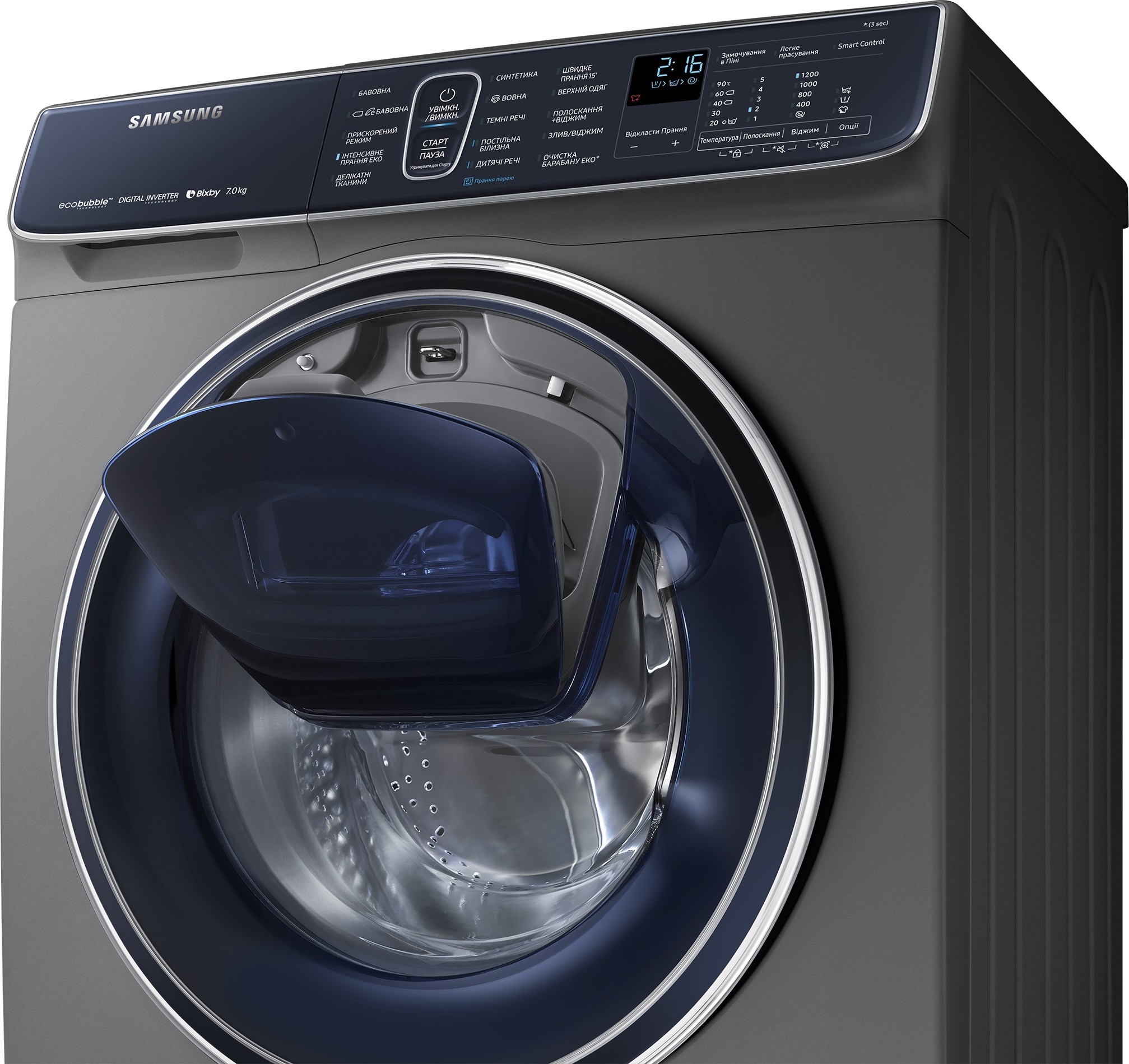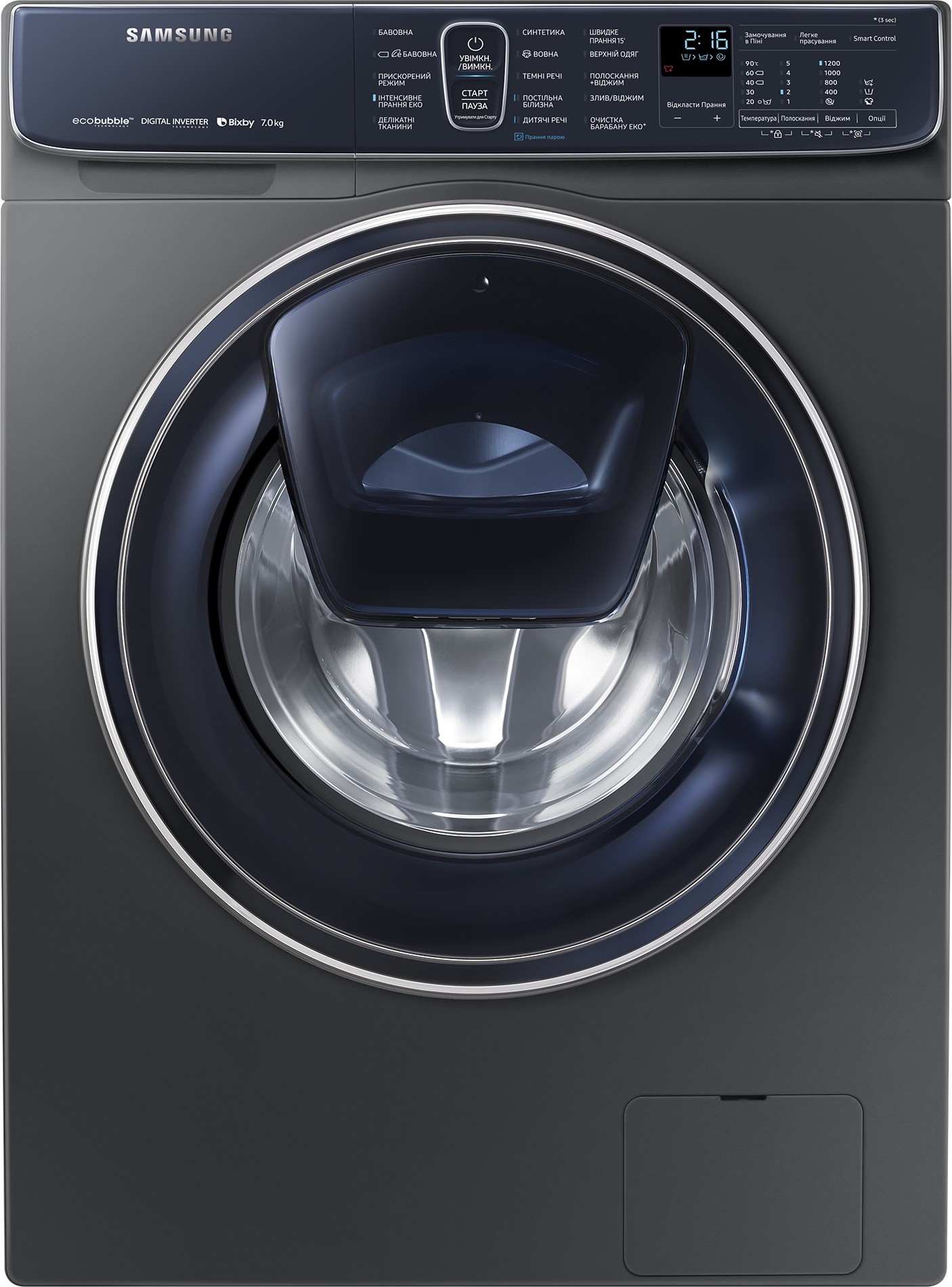 Добавляйте вещи в любое время цикла Функция Add Wash Не расстраивайтесь, если уже запустив стирку, вы вдруг найдете потерянную носок или поймете, что надо постирать еще рубашку. Дверцы Add Wash позволят вам просто и быстро добавить вещи или моющее средство после начала стирки. Вы также можете добавить в машину выстиранное вручную белье, которое нужно прополоскать или высушить. Стирка с системой искусственного интеллекта (ИИ) Bixby Вы можете более эффективно использовать свою стиральную машину. Система с использованием искусственного интеллекта (ИИ) Bixby повышает эффективность работы, опираясь на данные о взаимодействии с пользователем. Функция «Рецепты стирки» посоветует лучшие циклы стирки. «Планировщик стирки» оптимизирует график стирки. «Мастер HomeCare» позволяет проводить устранение неисправностей в отдаленный способ. Сила пузырей Eco Bubble Экономьте деньги и защищайте свою одежду. Технология Eco Bubble обеспечивает эффективную и бережную стирку даже при низких температурах. Средство для стирки превращается в пузырьки, которые быстро проникают в ткань и легко выводят загрязнения, защищая ткань, сохраняя ее текстуру и экономя энергию. Быстрая и эффективная стирка Суперскорость Сократите время стирки и получите более чистую одежду. Просто выберите функцию «Суперскорость», чтобы постирать полностью загруженную машину всего за 49 минут. Технология Eco Bubble обеспечивает мощное очищение, а время полоскания сокращается благодаря сочетанию быстрого распыления с дизайном барабана Swirl+ и ускорением скорости вращения. Быстрое выявление протечек AquaProtect Защитите свой пол и дом от случайного повреждения с системой выявления протечек AquaProtect. Она размещается под машиной и обнаруживает небольшие следы воды. В случае появления протекания система немедленно прекращает цикл стирки, сливает воду и выдает сообщение об ошибке. Таким образом, она сохраняет вас в безопасности и позволяет избежать потенциальных убытков. Гигиенично чисто Очистка барабана ЭКО+ Поддерживайте чистоту внутри стиральной машины. Режим очистки барабана ЭКО удаляет из барабана грязь и бактерии, вызывающие запах. Вам не нужен агрессивное или дорогое моющее средство, поскольку в этом режиме используется комбинация замачивания, полоскания и высокоскоростного вращения. А еще машина будет сообщать вам, когда необходимо произвести очистку. Очистка остатков Лоток StayClean Drawer Прекратите тратить моющее средство и избегайте надоедливую чистку выдвижного лотка. Лоток StayClean Drawer обеспечивает смывание большей части стирального средства специально разработанной системой промывки водой. Таким образом, в лотке остается меньше неиспользованного моющего средства, и он остается чистым и гигиеничным. Гигиеническая очистка Очистка паром Обеспечьте свою одежду действительно глубокой и гигиеническим очисткой с помощью пара. Цикл «Пар» улучшает качество стирки без предварительной обработки вещей. Пар выпускается со дна барабана, тщательно насыщая все вещи. Это устраняет въевшуюся грязь и 99,9% бактерий и аллергенов. Меньший уровень шума и энергопотребления Цифровой инвертор Наслаждайтесь повышенной энергоэффективностью, пониженным уровнем шума и длительной службы. В технологии цифрового инвертора используются сильные магниты для увеличения мощности, но такое устройство работает тише и п