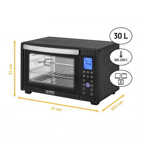 Набагато полегшує повсякденне життя: економте час приготування їжі за допомогою чудової міні-духовки. Уся чорна, загострена з оздобленням з нержавіючої сталі, компактна міні-духовка з внутрішнім освітленням і плавним регулюванням температури до 230° не тільки виглядає добре, але й економить час і нерви під час приготування. Запікати, смажити на грилі, смажити, смажити - все вдається без особливих зусиль. Ви також економите гроші порівняно зі звичайними духовками: мінідуховка в рази енергоефективніша. Доступні дві висоти стійки для роботи з верхнім нагріванням, нижнім нагріванням і конвекцією. Включає знімний піддон для крихт для легкого очищення.