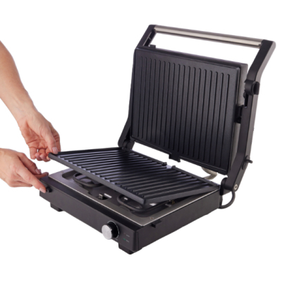 | Особливості | знімні пластини, піддон для жиру, Контейнер для рідини Захисна защіпка Гумові ніжки Індикатор нагрівання Індикатор роботи Знімні пластини Піддон для збирання жиру Термостат Термоізольовані ручки, ручка, що не нагрівається, нековзні ніжки, регульований термостат, індикатор роботи, відкриття на 180 ° |