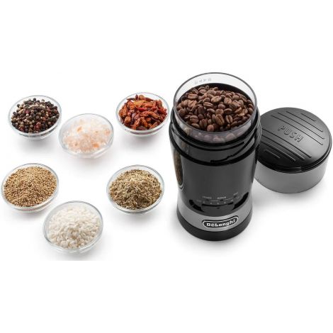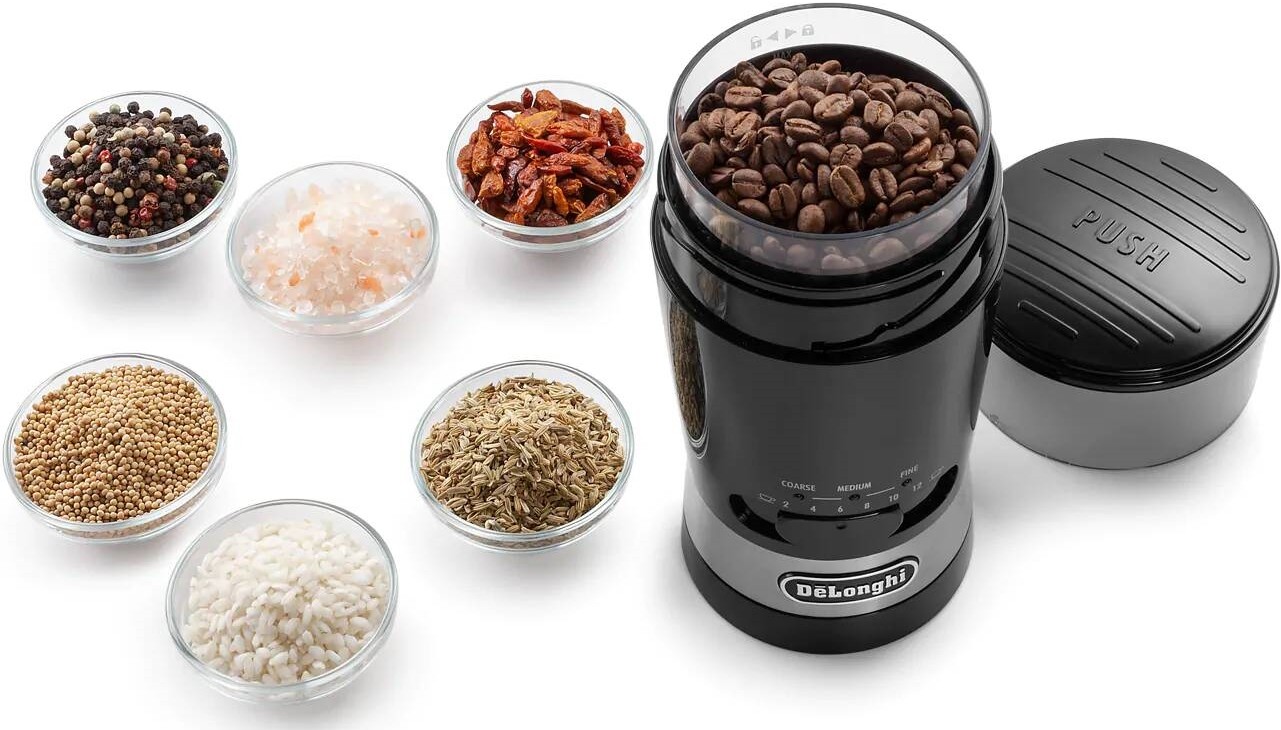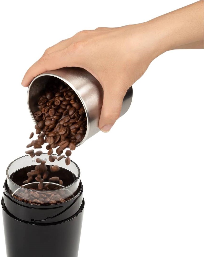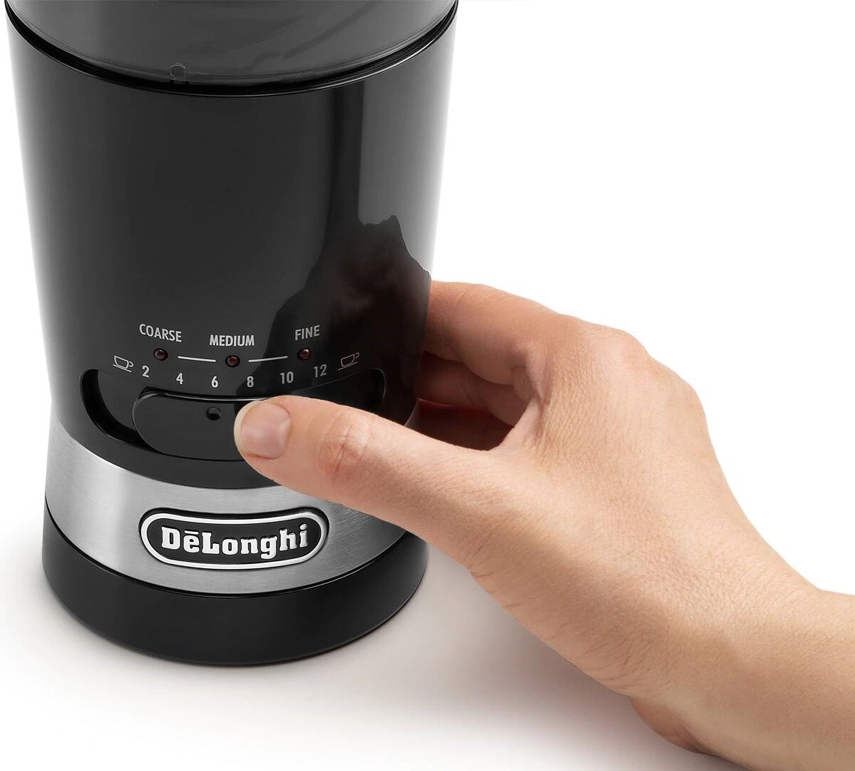 Лезвия Лезвия из нержавеющей стали измельчают кофейный порошок. 3 степени помола Селектор измельчения позволяет выбирать между тонким, средним или грубым помолом. Кнопка измельчения Кнопка измельчения позволяет измельчать бобы, пока вы не получите желаемую консистенцию. Нажмите и удерживайте, пока не загорится соответствующий индикатор для грубого, среднего или точного измельчения. До 12 чашек Выберите количество чашек, которые вы хотите размолоть: от одной до 12.