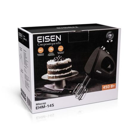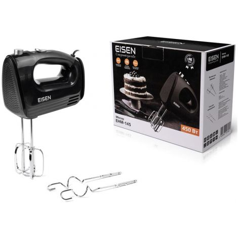 Сучасна модель EISEN EHM-145 представлена у класичному чорному кольорі. Корпус міксера виготовлений із якісного пластику, а вінчики для збивання та гаки для тіста – із нержавіючої сталі.