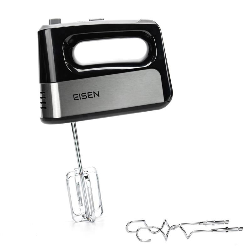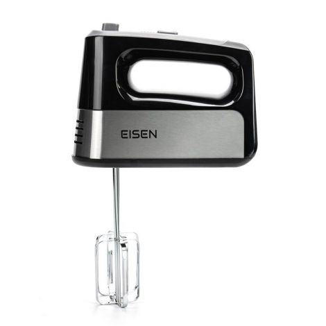 Сучасна модель EISEN EHM-345 представлена у чорному кольорі. Корпус міксера виготовлений із якісного пластику, а вінчики для збивання та гаки для тіста – із нержавіючої сталі.