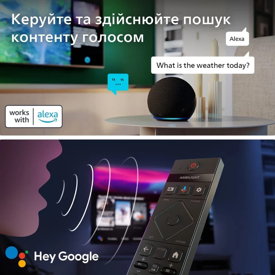 Яскравий перегляд із надчітким зображенням Насолоджуйтеся будь-яким контентом на цьому світлодіодному телевізорі 4K UHD. Процесор Philips Pixel Precise Ultra HD оптимізує якість зображення для відтворення надчіткого зображення, насичених кольорів і плавних рухів. Ви щоразу отримуватимете найкращі враження від перегляду. Розваги, які ви любите, з невеликою допомогою від Google Що бажаєте переглянути? Google TV об’єднує фільми, шоу та багато іншого з усіх застосунків і підписок та впорядковує їх для вас. Ви отримаєте пропозиції на базі того, що вам подобається, і ви навіть можете скористатися застосунком Google TV на телефоні, щоб складати свій список перегляду на ходу. Dolby Atmos для кінематографічного звуку Dolby Atmos занурює вас у глибину, розміщуючи звукові ефекти в просторі навколо та над вами. Незалежно від того, чи це космічні кораблі, що пролітають над головою, чи тихі кроки, що лунають ззаду, ви відчуєте, що перебуваєте в самому центрі подій. Чудовий варіант для ігор. VRR і низька затримка вводу на будь-якій консолі HDMI 2.1 дозволяє вам отримати максимум переваг від консолі, забезпечуючи швидкий геймплей і плавну графіку. Підтримується змінна частота оновлення (VRR), а під час увімкнення консолі автоматично активується налаштування низької затримки вводу. Пульт дистанційного керування з переробленого пластику. Відповідальне пакування Цей телевізор 4K UHD має елегантний, стриманий вигляд, який підійде практично до будь-якого інтер’єру. Пульт дистанційного керування виготовлено з переробленого пластику, пакування — з переробленого картону, сертифікованого FSC, а друковані матеріали — з переробленого паперу. Працює з голосовими помічниками та Apple AirPlay Обирайте голосових помічників самостійно! Натисніть кнопку Google Асистент на пульті дистанційного керування, і ви зможете використовувати голосові команди, щоб знаходити фільми та шоу, отримувати рекомендації, керувати сумісними пристроями розумного дому тощо. Або попросіть Alexa керувати телевізором через пристрої з підтримкою Alexa. Без зусиль транслюйте на телевізор контент з iPhone, iPad або Mac. Дивіться фільми з додатків. Діліться фотографіями з друзями в кімнаті. Легко підключається до мереж розумного дому Легке підключення до мереж розумного дому. Сумісність із Matter and Control4.