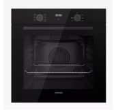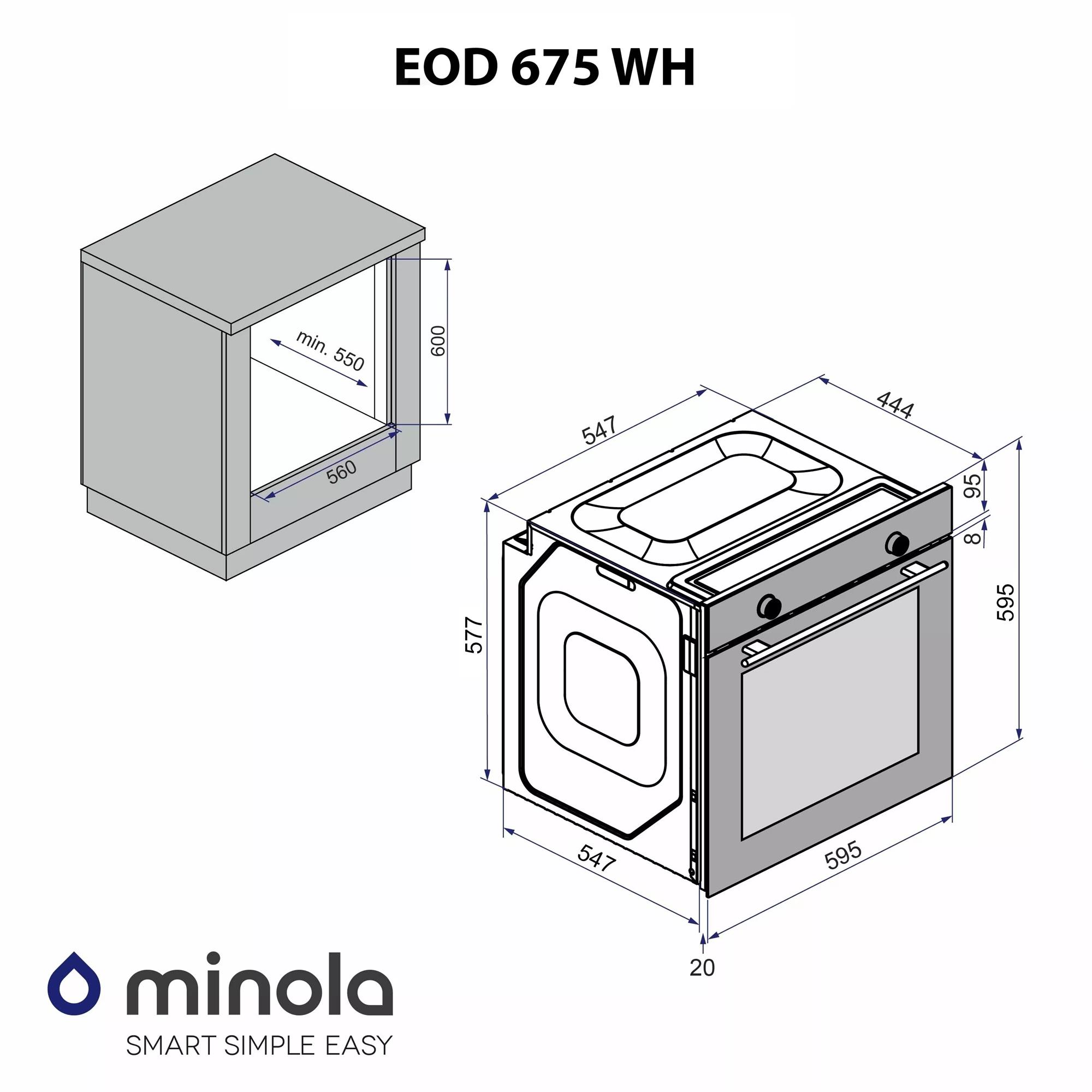 Електрична духова шафа Minola EOD 675 — втілення сучасних технологій Вбудована духова шафа поєднує в собі стильний зовнішній вигляд, зручність у використанні та мультифункційність. 7 найбільш необхідних режимів для приготування Модель має 7 різних програм для реалізації різноманітних рецептів. Додаткові функції духової шафи включають конвекцію й таймер, що дозволяє вам налаштовувати час і температуру для оптимального приготування. Окрім того, модель доповнена системою тангенціального охолодження. Воно виводить зайве тепло за допомогою вентилятора та захищає меблі від впливу конденсату. Корисний об’єм внутрішньої камери та покриття Easy Clean Простора внутрішня камера об’ємом 72 л вкрита інноваційною антипригарною емаллю. Вона забезпечує легке очищення від жирів та інших забруднень. Очищення відбувається наступним чином: налийте воду у деко, увімкніть нижній нагрів та встановіть температуру на 100 °C. Утворена пара розщеплює жир та бруд всередині камери, а залишки можна протерти губкою, використовуючи звичайні миючі засоби без абразивів. 5 рівнів рельєфних напрямних і аксесуари в комплектації Модель укомплектована універсальним деком, решіткою та обладнана п’ятьма рівнями напрямних. Вони дозволяють регулювати відстань між стравами, забезпечують рівномірне приготування та надійне положення аксесуарів. Залежно від технології готування страв, ви можете обирати потрібний рівень напрямних або готувати декілька страв одночасно. Дверцята з подвійним склінням від провідного бренду SCHOTT Дверцята духової шафи мають подвійне скло від німецького бренду SCHOTT, яке забезпечує ефективну термоізоляцію. Воно зберігає тепло всередині камери, знижує споживання електроенергії та захищає від опіків. Скло можна легко вилучити. Просто натисніть спеціальні кнопки з обох боків дверцят. Це значно спрощує процес очищення. Сучасна та мультифункційна панель управління Керування духовою шафою реалізоване у вигляді поворотних утоплюваних ручок з термостійкого пластику та сучасного дисплея. Ручки дозволяють легко та безпечно обирати режими та температуру, а дисплей — налаштовувати час, таймер та звукові сповіщення.