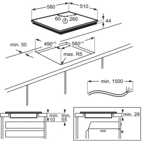 | Діаметр і потужність конфорок | Передня права 1.4/2.5 кВт, 145 мм, Задня права 1.8/2.8 кВт/180 мм, Передня ліва 2.3/3.2 кВт/180-210мм, Задня ліва 2.3/3.2 кВт/ 210 мм |