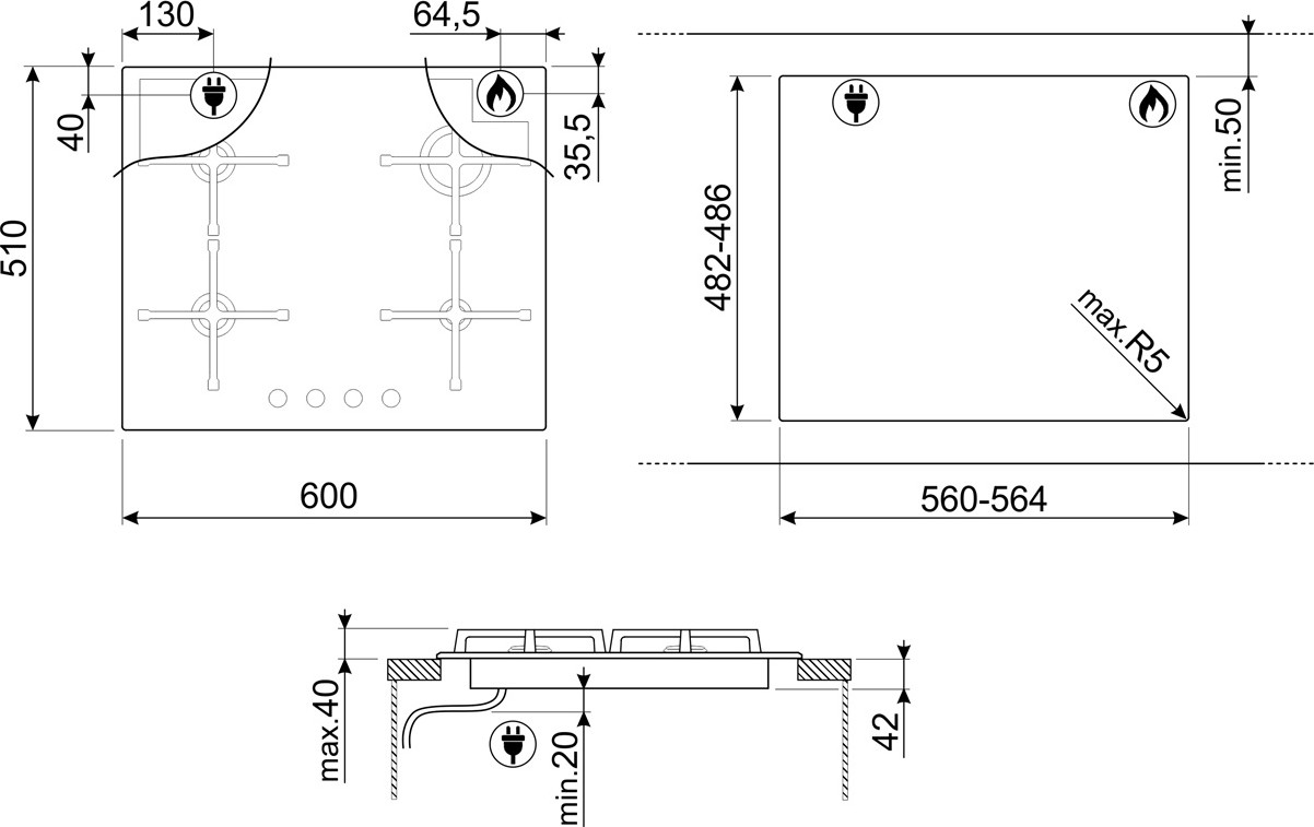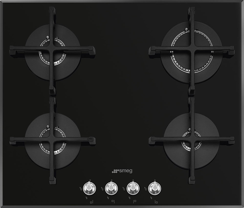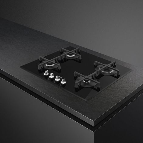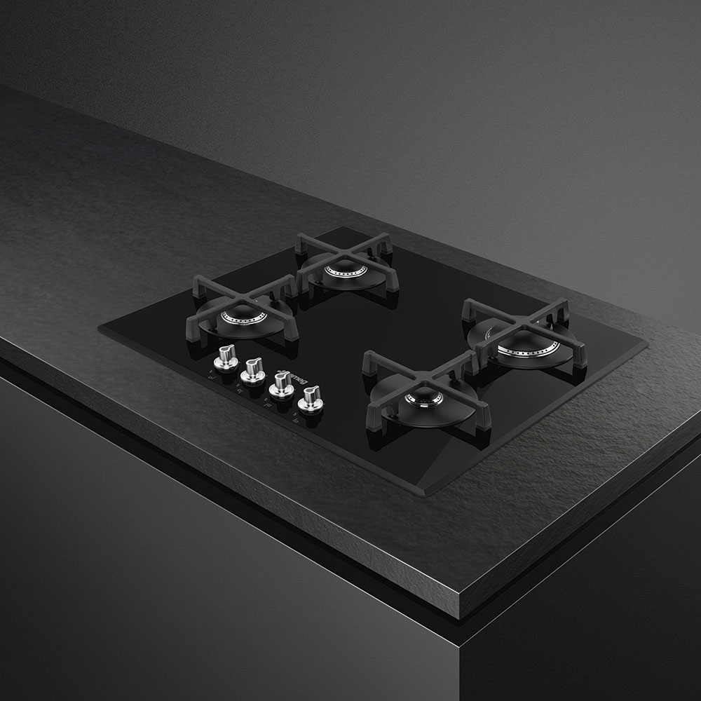 Газовая варочная панель, 60 см, черное стекло, скошенный край.