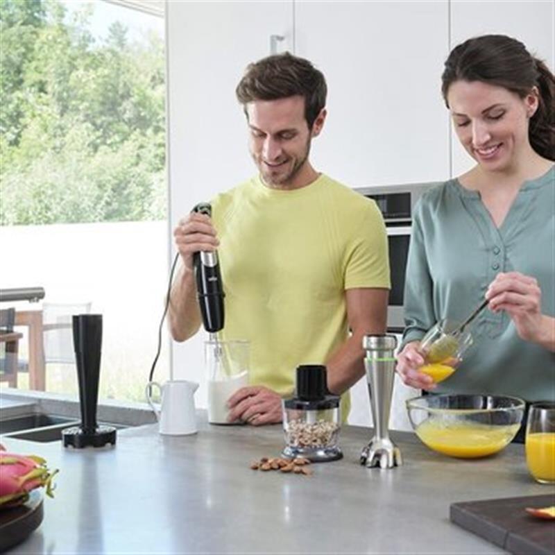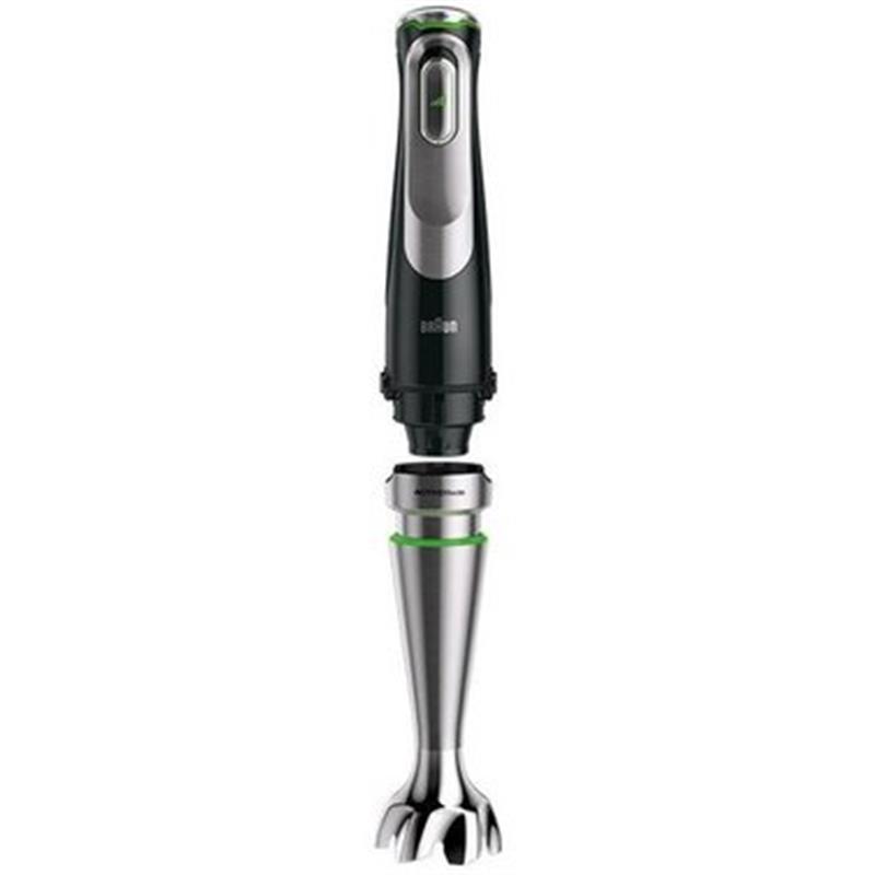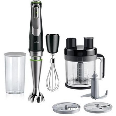 Традиционно считается, что ручные блендеры являются относительно простыми приборами, которые можно использовать как вспомогательный инструмент и не более. Если вы тоже так думаете, наверняка пришло время купить погружной блендер Braun MQ 9175 XL. По функционалу он запросто сравнится с кухонным комбайном и подойдет для решения почти любых кулинарных задач. Незаменимое приобретение для современной кухни! В эргономичном корпусе размещен мощный моторный блок на 1200 Ватт с особой фирменной системой регулировки скорости. Привычных кнопок у блендера нет, переключатель скоростных режимов встроен в рукоятку – чем сильнее сжимаете, тем выше скорость вращения лезвий или насадок.