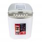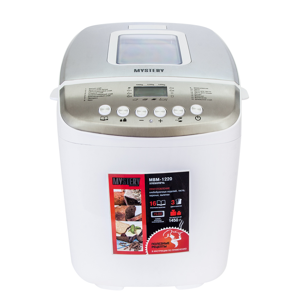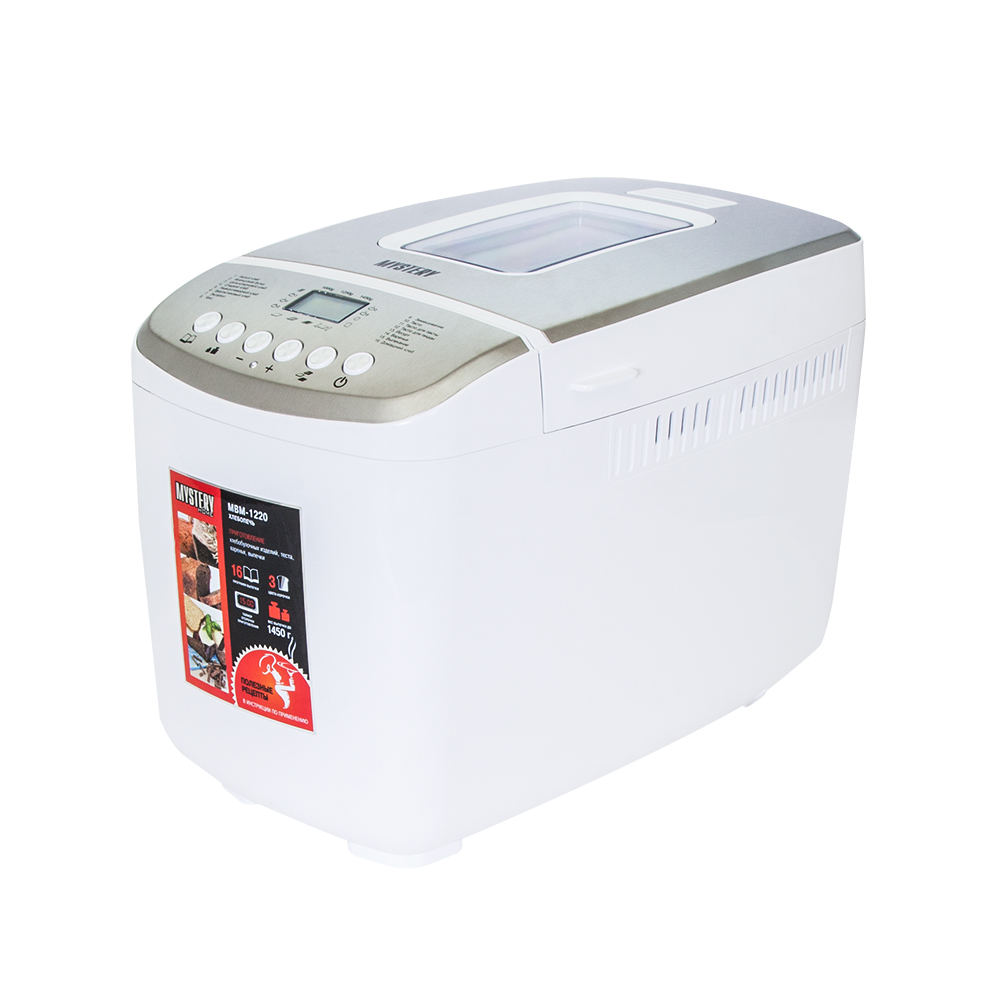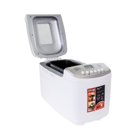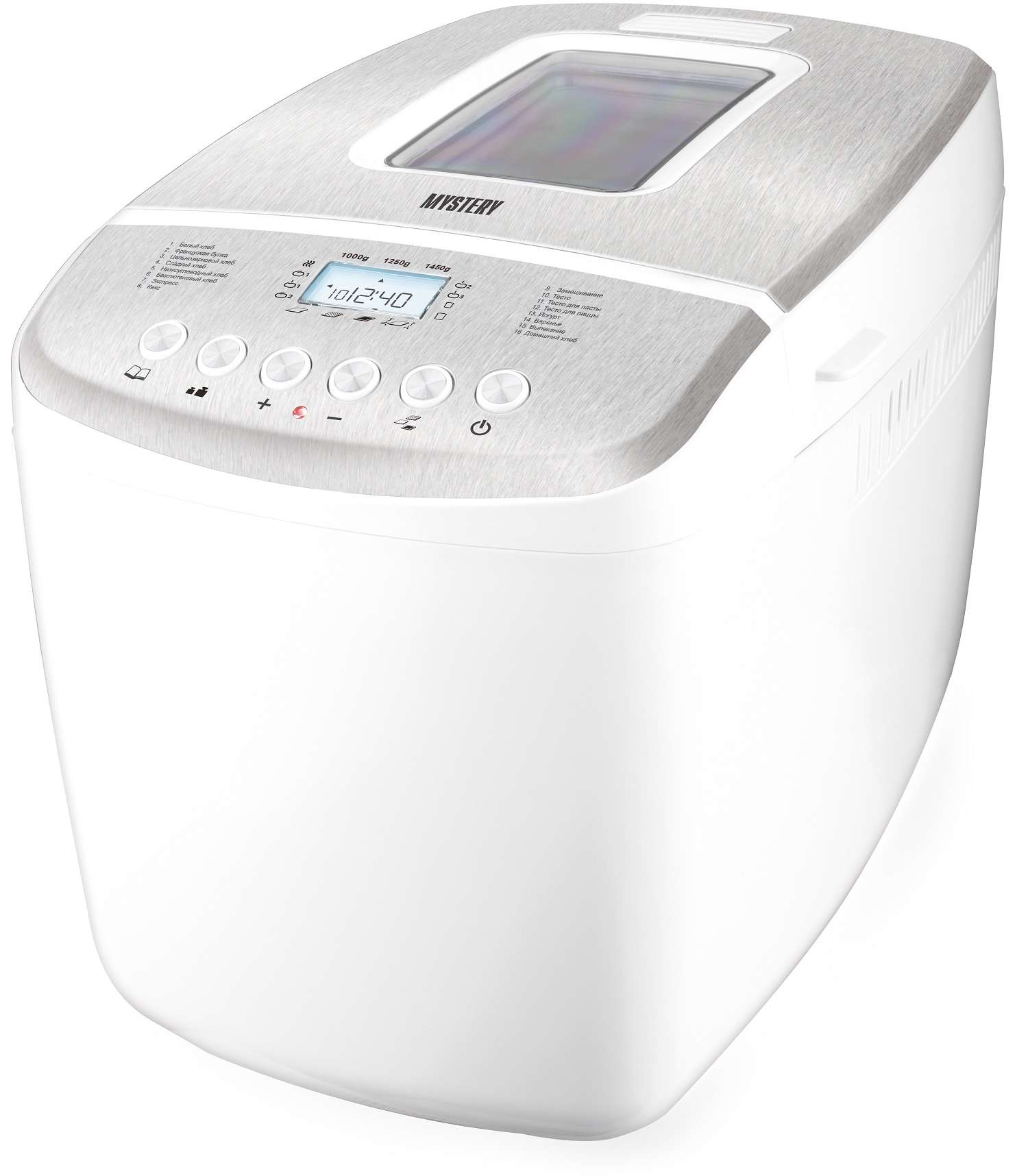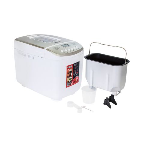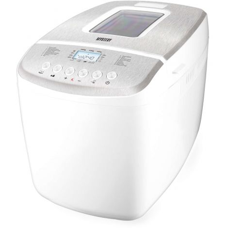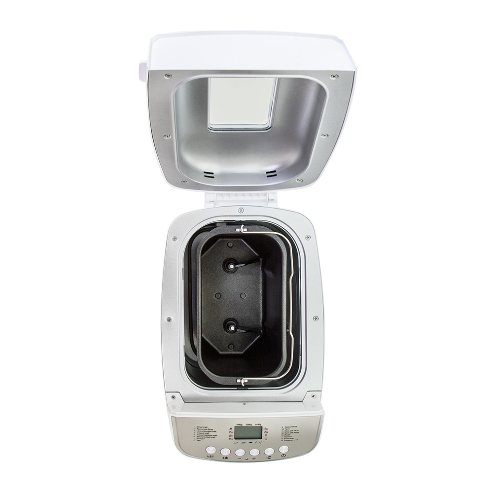 Хлебопечка белого цвета с мощностью 850 Вт, дисплеем, электронным управлением, большим количеством программ выпечки, поддержанием температуры, а также таймером отсрочки.