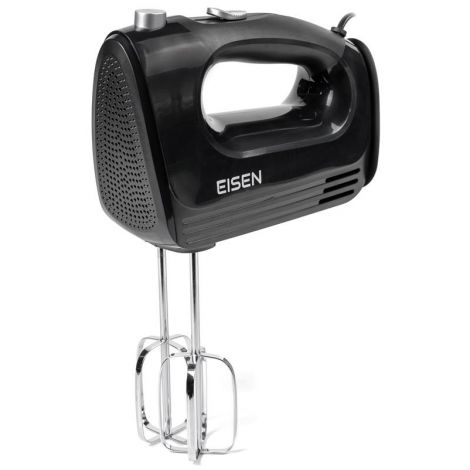Сучасна модель EISEN EHM-145 представлена у класичному чорному кольорі. Корпус міксера виготовлений із якісного пластику, а вінчики для збивання та гаки для тіста – із нержавіючої сталі.