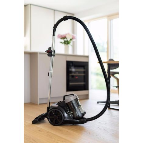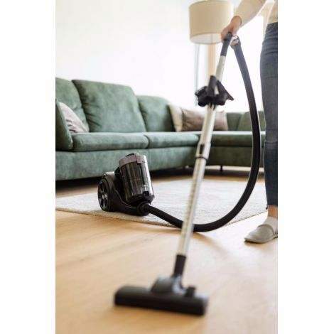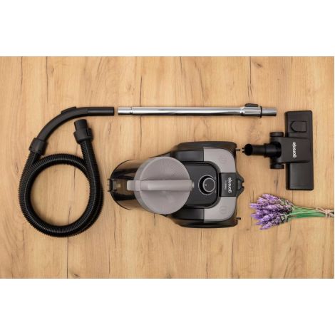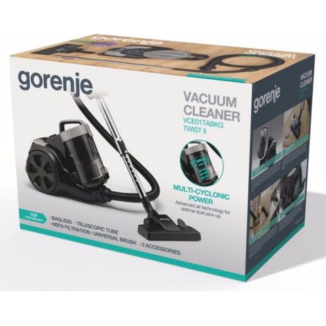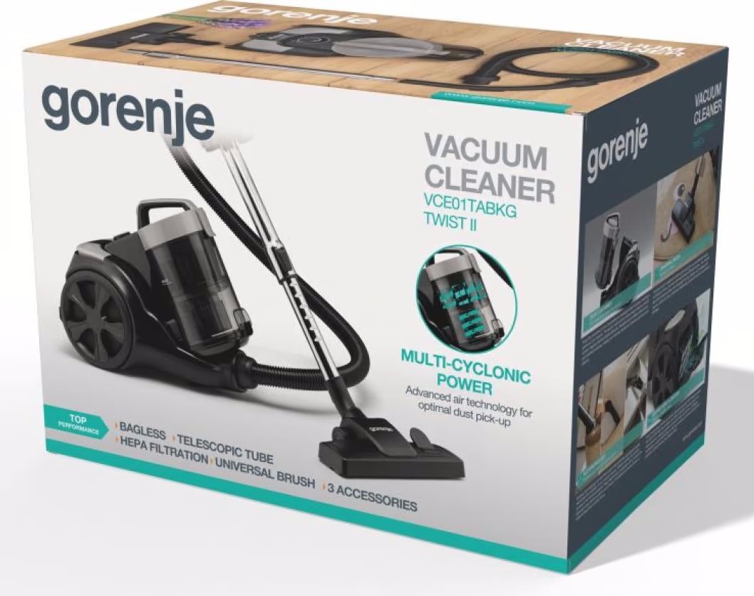 Пилосос Gorenje VCE01TABKG — це надійний помічник для сухого прибирання, який поєднує високу потужність та зручність у використанні. Оснащений двигуном із потужністю 950 Вт та силою всмоктування 140 Вт, він легко справляється з пилом і дрібним сміттям на різних типах підлогових покриттів. Модель обладнана прозорим пилозбірником об’ємом 3,3 л, завдяки чому можна контролювати його наповнення та швидко очищати при потребі. Система фільтрації з HEPA-фільтром ефективно затримує дрібнодисперсний пил і алергени, забезпечуючи чисте повітря в приміщенні. Циклонна технологія Multicyclonic Power підвищує ефективність роботи, утримуючи пил усередині контейнера. Для зручності користувача передбачене регулювання потужності безпосередньо на корпусі пилососа. Телескопічна металева трубка та набір насадок (щілинна, універсальна, для м’яких меблів і делікатних поверхонь) роблять прибирання універсальним та комфортним. Подвійна система парковки — вертикальна і горизонтальна — дозволяє зручно зберігати пристрій навіть у невеликих приміщеннях. Автоматичне намотування шнура спрощує підготовку до роботи та прибирання після неї. Рівень шуму становить 79 дБ, що робить модель досить тихою для свого класу. Пилосос Gorenje VCE01TABKG — це поєднання ефективності, практичності та сучасного дизайну для щоденного догляду за домом.