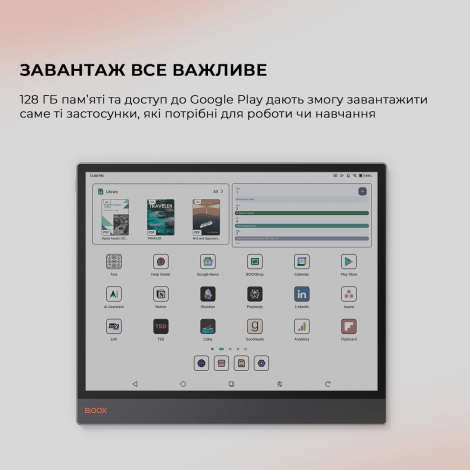 BOOX Tab XC – це 13,3-дюймовий кольоровий електронний рідер, заснований на високопродуктивній апаратній платформі та з широкими можливостями роботи з документами. Модель має сенсорний екран E Ink Kaleido 3 з фронтальним підсвічуванням та регулюванням колірної температури, а також подвійним сенсорним керуванням. Ємнісний датчик дозволяє зручно керувати пристроєм, а індуктивний датчик дає можливість робити малюнки та рукописні нотатки. Модель базується на потужному 8-ядерному процесорі та 6 ГБ оперативної пам’яті. Новий графічний процесор з технологією BOOX Super Refresh забезпечує швидке оновлення екрана та плавний рух об’єктів на екрані. Tab XC ідеально підходить не тільки для читання, але й для роботи з різними типами документів, включаючи кольорові зображення. Операційна система Android 13 дозволяє встановлювати та використовувати сторонні програми. Вбудований модуль Wi-Fi надає можливість завантажувати файли з Інтернету та користуватися різними мережевими сервісами, а підтримка Bluetooth дозволяє підключати зовнішні пристрої. 128 ГБ вбудованої пам’яті дає змогу зберігати в пристрої будь-які необхідні електронні книги та документи без будь-яких обмежень. Пристрій виготовлений у легкому та міцному корпусі. Корпус зі сплаву алюмінію та магнію, екран додатково покритий захисним склом. Модель підтримує активний стилус для рукописних нотаток та малюнків. Акумулятор високої ємності 5500 мАг забезпечує тривалий час автономної роботи. Для Tab XC доступні 2 типи чохлів – магнітний чохол та спеціальний чохол із клавіатурою та трекпадом, що підходить для зручного набору тексту. Ці чохли можна придбати окремо. Їх можна використовувати для захисту BOOX Tab XC під час транспортування. Встановлення додатків Тривала робота Підтримка мов та словників Вбудований G-сенсор Пристрій підтримує OTG Інструмент, такий же гострий, як і ваші ідеї Tab XC поєднує цифрову зручність та передові інструменти в надтонкому дизайні товщиною 5,3 мм. Його елегантний, професійний дизайн бездоганно адаптується до будь-якого робочого середовища. Просторий. Барвистий. Приємний для очей Широке, барвисте полотно забезпечує комфортний перегляд, позбавлене різкого відблиску традиційних екранів. Його ніжні, природні відтінки роблять перегляд, читання та виконання мультимедійних завдань легкими та приємними. Чуйний. Потужний Tab XC плавно переходить між роботою та особистим життям завдяки своєму вдосконаленому восьмиядерному процесору та 6 ГБ оперативної пам’яті. Завдяки технології BOOX Super Refresh? він без зусиль справляється зі складними завданнями та забезпечує плавний перегляд вебсторінок. Це кольоровий планшет на електронному папері По суті, це центр продуктивності, який забезпечує надійну роботу для щоденних завдань, зменшує навантаження на очі та мінімізує відволікаючі фактори. Тільки те, що вам потрібно Маючи доступ до Google Play Store та 128 ГБ пам’яті, ви можете завантажувати потрібні вам програми. Налаштуйте свій робочий процес, щоб зробити його унікальним. Створіть цілеспрямований робочий простір Насолоджуйтесь перевагами технологій, не перериваючи їх рекламою та нескінченним гортанням стрічок. Розумні інструменти для письма Легко розробляйте ідеї, переглядайте документи або перетворюйте грубі каракулі на вишукані форми, виділення та підкреслення за допомогою інструментів Smart Scribe. Завдяки 
