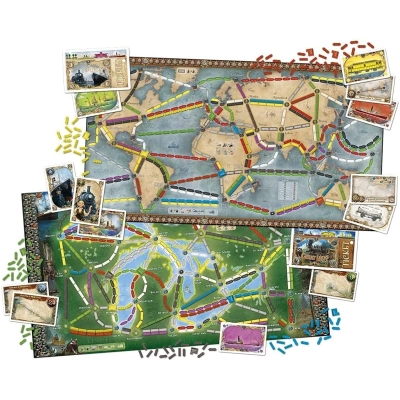 | Комплектація | двостороннє ігрове поле; 250 пластикових кораблів (по 50 кожного кольору); 165 пластикових вагонів (по 33 кожного кольору); 120 карт маршрутів (65 для світу, 55 для Великих озер); 80 карт поїздів; 60 карт кораблів; 15 пластикових гаваней; 5 фішок для підр |