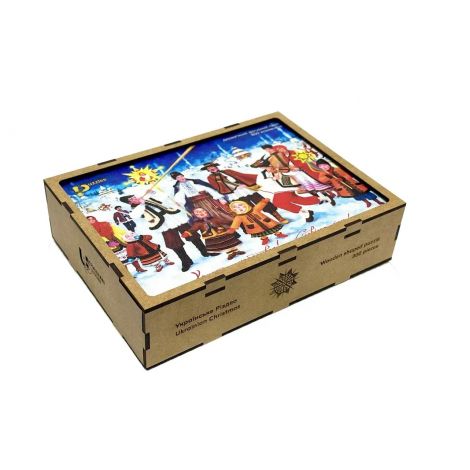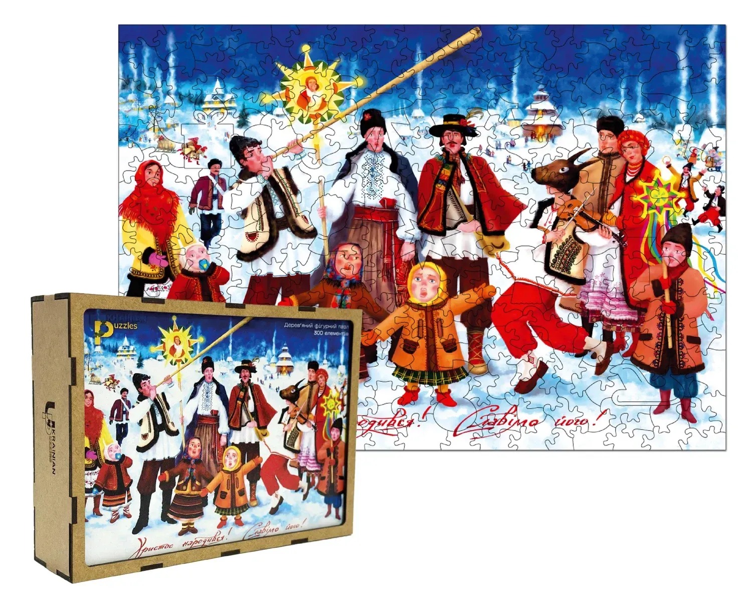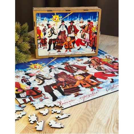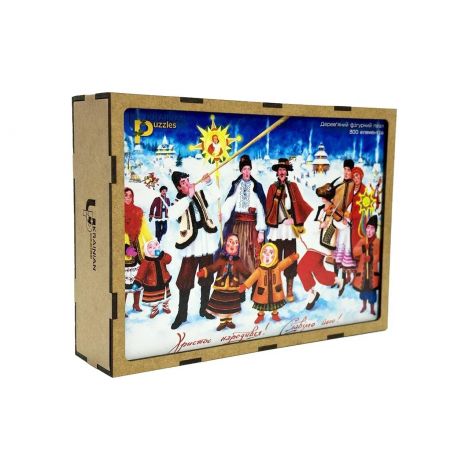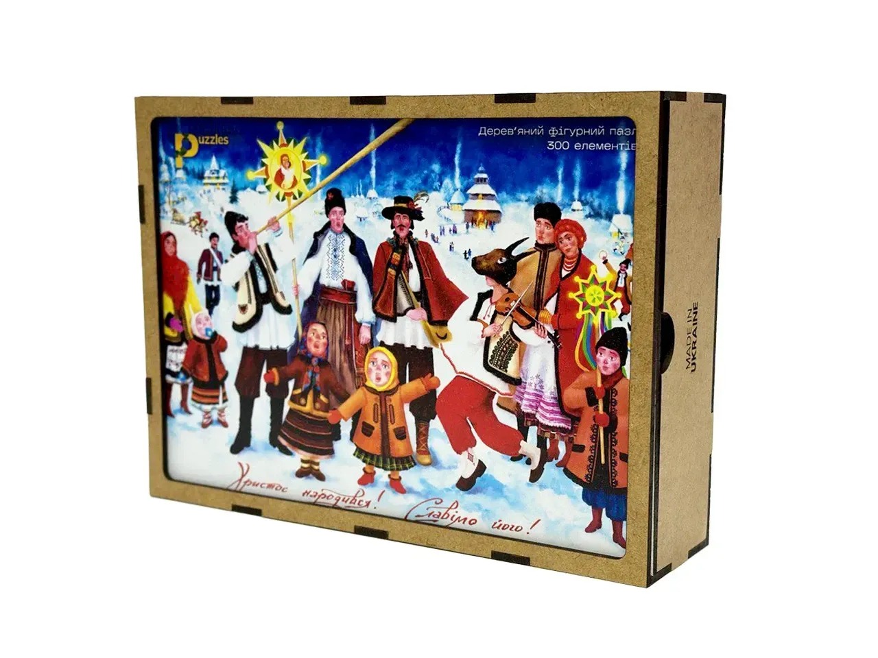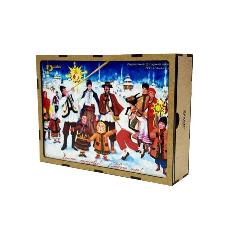 Дерев’яний фігурний пазл «Українське Різдво». Зануртеся в чарівну атмосферу традиційного українського Різдва разом із цим унікальним дерев’яним пазлом. Цей пазл стане чудовим подарунком для шанувальників української культури або для сімейних вечорів за складанням. Відкрийте для себе магію українського Різдва в кожній деталі! Чим особливий цей пазл? Різдво в Україні - це цикл святкувань християнами Різдва Христового, які тривають з 25 грудня по 6 січня (раніше за старим календарем з 7 по 19 січня). Складаються з трьох основних свят: Різдво, Щедрий вечір і Водохреща. У цей час діє особливе вітання «Христос народився!», на яке відповідають «Славімо його!». Період різдвяних свят - це великий культурний спадок традиційної обрядовості в Україні, який увібрав у себе найтиповіші види народно-драматичної творчості українців. Вечір 24 грудня називається Святвечором, а ніч на 25 грудня - Колядою. Свята вечеря є його центральною традицією - готується 12 пісних страв за кількістю апостолів. Атрибутом різдвяної вечері є дідух - обжинковий сніп, який урочисто стоїть протягом усіх різдвяних свят у хаті. Важливим атрибутом Різдва в Україні є колядування. Колядки - величально-поздоровчі пісні з побажанням добробуту господарям. Колядники носять з собою велику зірку, що символізує Вифлеємську зірку. Іншим особливим традиційним атрибутом святкування Різдва в Україні є вертеп – театреалізоване дійство з перевдяганням, яке через вуличну виставу та гру живих людей розповідає історію народження Христа.