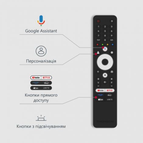 Ергономічний пульт дистанційного керування з підсвічуванням дозволяє керувати всім, навіть при слабкому освітленні. Вбудований Google Асистент дозволяє інтуїтивно керувати телевізором за допомогою голосових команд. Шукайте улюблені фільми, запитуйте рекомендації за настроєм або керуйте сумісними смарт-пристроями — все це за допомогою зручного голосового керування. Насолоджуйтесь повною інтеграцією з розумним будинком і можливістю відтворювати музику, шукати фільми та відкривати додатки.